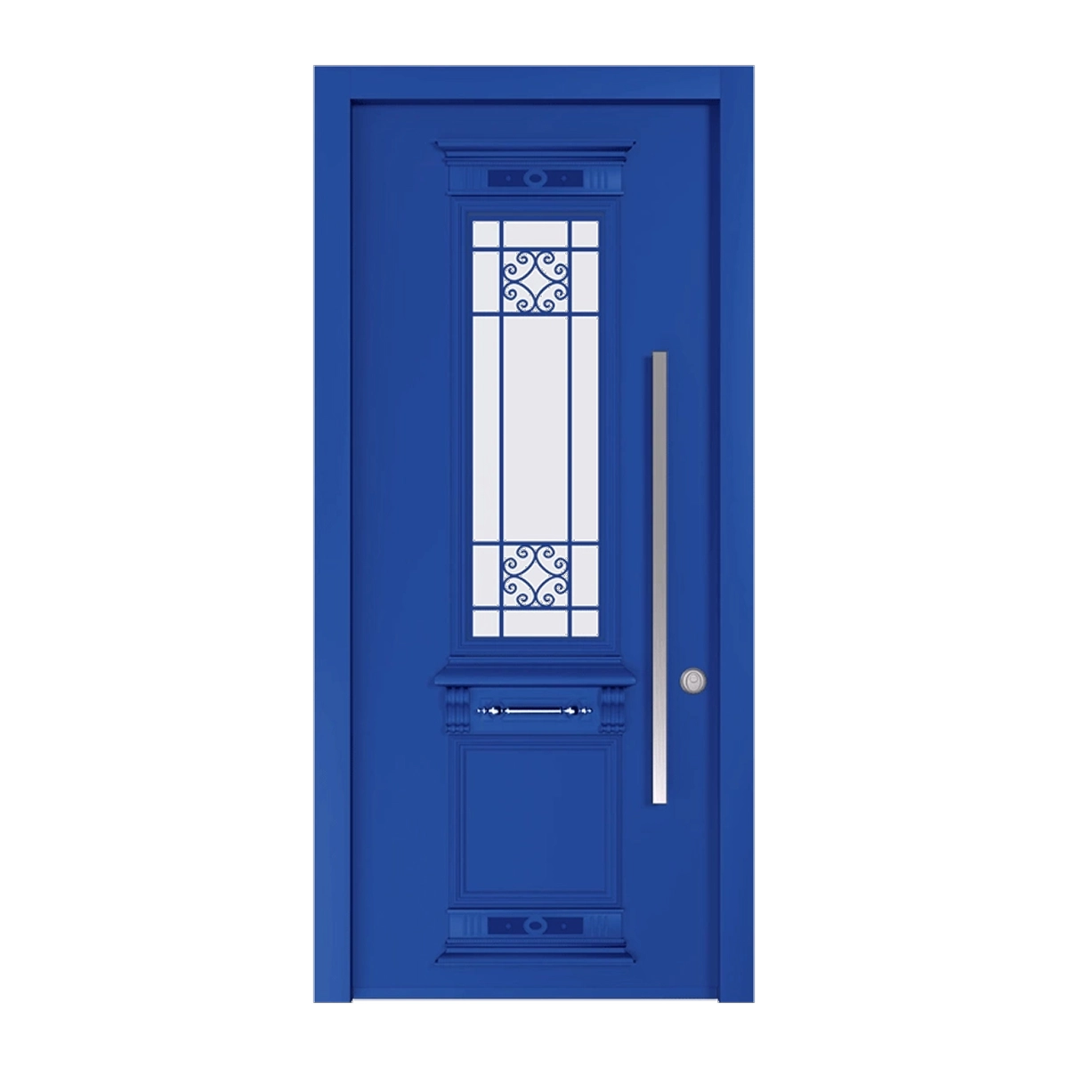 דלת כניסה דגם 6012 בסגנון יווני קלאסי עם חלון זכוכית מעוטר וניגודיות מודגשת למראה יוקרתי ובולט.