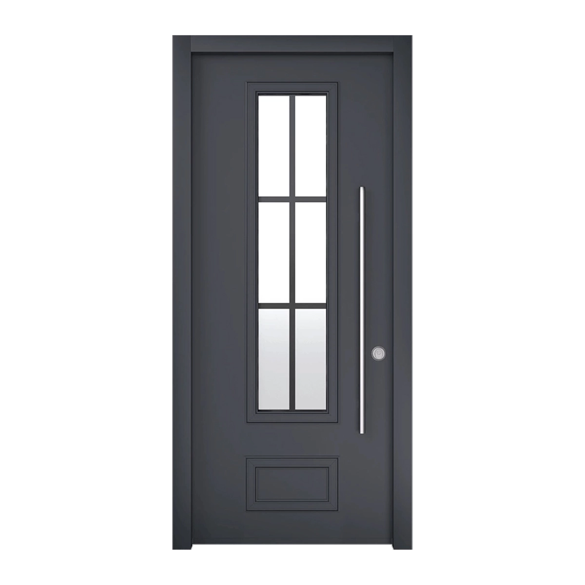 דלת כניסה דגם 8010 עם חלון זכוכית בחלוקה גאומטרית נקייה, המשלבת מראה קלאסי עם נגיעה מודרנית.