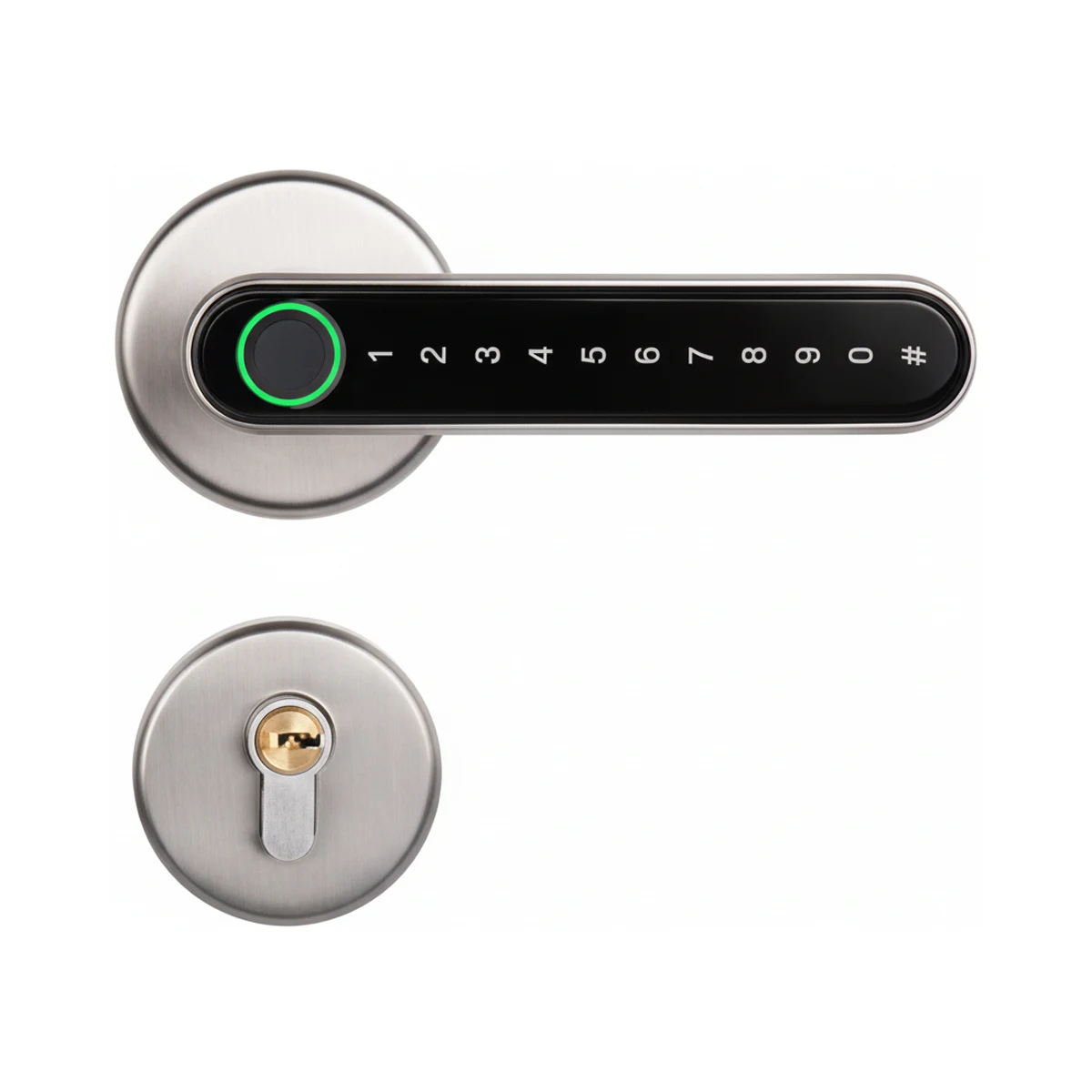 ידית קוד אלקטרו־ביומטרית חכמה מבית רב בריח המאפשרת פתיחה באמצעות אפליקציה, טביעת אצבע או קוד דיגיטלי ומתאימה לניהול הרשאות וגישה לדלתות כניסה לבית או למשרד